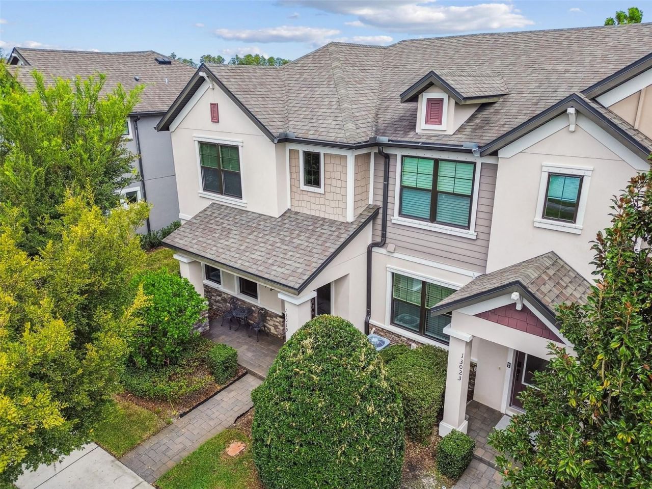 IMMACULATE/MAINTENANCE FREE EXTERIOR south facing townhome in sought-after Starkey Ranch in Odessa, FL, is now available. This STUNNING mediterranean style 3 bedroom, plus flex/office space on main floor/ 2.5 bathroom, 2 car attached garage home is an END UNIT offering a water view, professional landscaping and paver front porch. Built by MI Homes, this Prescott floor plan is limited. Once inside, take note of the inspiring 2-story entrance with BALCONY, tall ceilings, and gorgeous engineered hard-wood staircase. There is UVA security film on 2nd story windows and front door to protect them should they be hit during a storm, and also helps in maintaining a cooler temperature. Modern wood-like tile flooring throughout the main level. Upgraded 5 1/4 inch baseboards. Newer interior neutral paint. Continuing through to your left you have the flex space with french doors perfect as an office, craft room, play room, or a 4th bedroom (no closet). Designer lighting lights up the foyer that leads you to the heart of the home. Laundry room is on main floor providing additional storage and built-in-shelving. Washer and dryer included. 1/2 bath for convenience. The living room is light and bright with picturesque windows and connects to the kitchen for easy entertaining/conversation. Open floor plan. Custom shiplapped electric fireplace with mantel provides a cozy feel. Deluxe kitchen provides stainless steel appliances, gas range, granite counter tops, shiplapped island for additional seating, ample counter space with custom backsplash and under cabinet lighting. 42 inch espresso cabinets with trim molding. Spacious pantry. Upstairs enjoy NO CARPET and the newer luxury vinyl flooring with counter round detail. On one side you have a large bedroom that is very quiet and private. Full bathroom- walk in shower- is shared with this room and the 2nd spacious room and has a tiled shower with listello details, a built-in wall niche, and granite sink. On the other end is the primary retreat with beautiful views and windows and lots of space. Ensuite bathroom provides walk-in shower with tile and listello details and built-in wall niche. Both bathrooms have custom mirrors. From the kitchen, open the side door to you outdoor oasis that is screened in and enclosed for privacy. This is certainly an additional space to relax and unwind in. Off of the porch/lanai is the attached 2 car garage with epoxy flooring. This home is situated perfectly within the community nearing both entrances. The Starkey K8 school is close as well as grocery, restaurants, medical, and entertainment. Parking spaces along the front of the townhomes are there for convenience and guest parking. Starkey Ranch is well known and sought after. Close to the Veterans Expressway for easy travel to Tampa/Clearwater. A-rated schools. There is a full time dedicated lifestyle staff that hosts year round activities. Exterior just painted 10/2025. Do not wait to get in before the buyer rush comes! View video link for floor plan and virtual walk though.